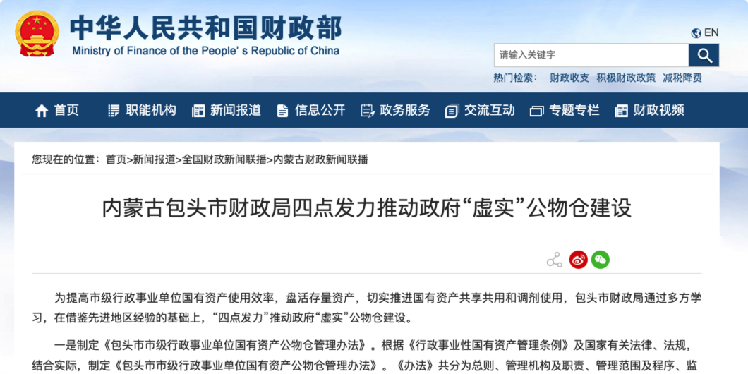 2022年3月16日,财政部官方网站又发布标题为《内蒙古包头市财政局四点发力推动政府“虚实”公物仓建设》的官方报道,其中...